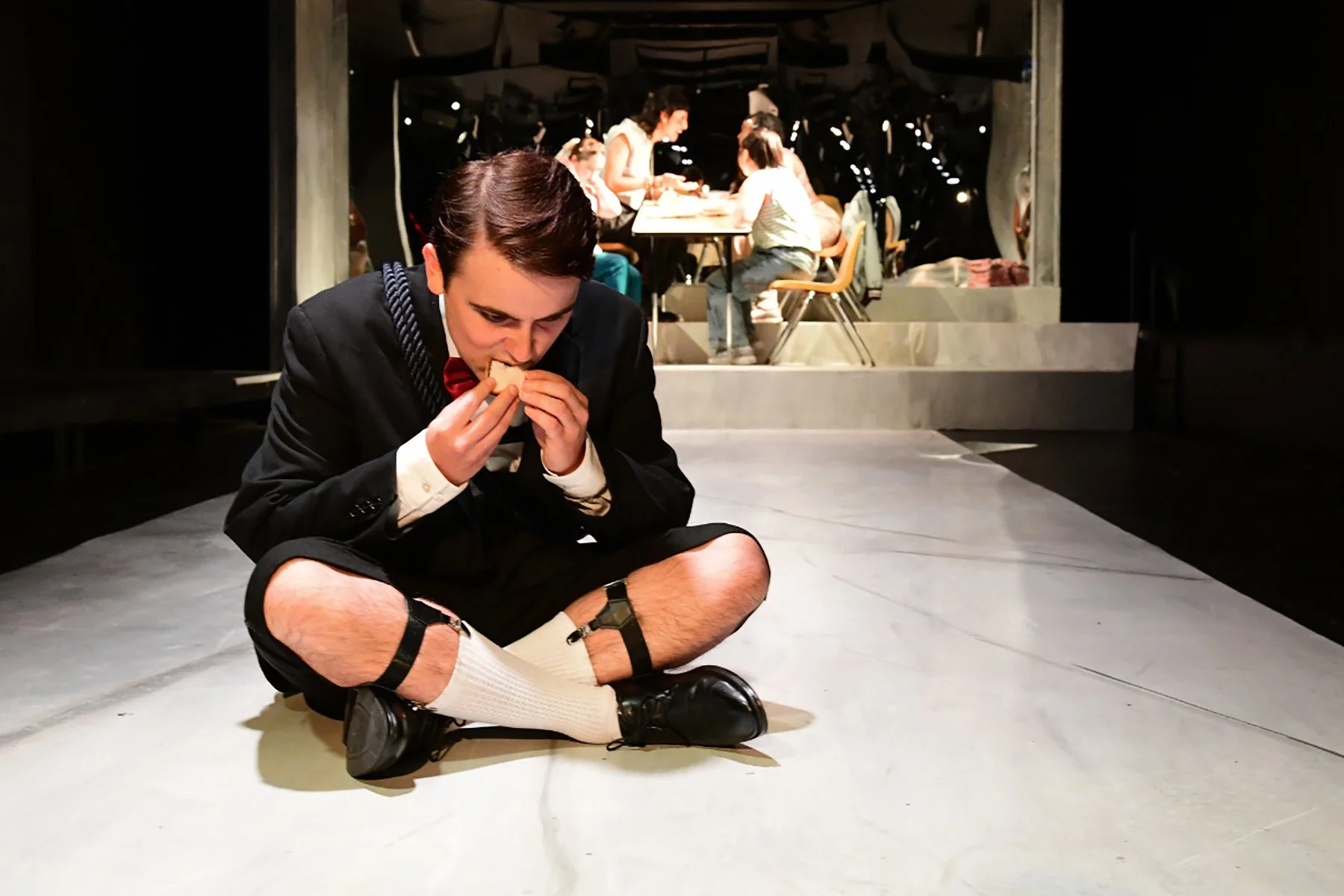 They must recreate scenes from school exactly as Chelsea wants them too. Soon this playacting becomes a sick and twisted game going through each traumatic core memory Chelsea has being the outcast friend of this friend group. Chopson has this way of moving her head and eyes almost like a snake. She peers up underneath her brows as an evil smile slowly crawls across her face, widening like a python delighted that her prey has decided to play. She fully embodies the weird girl in middle school (which translates to maybe a little socially awkward, doesn’t quite know how to fit in) and is absolutely thrilling to watch as she commands the stage.
