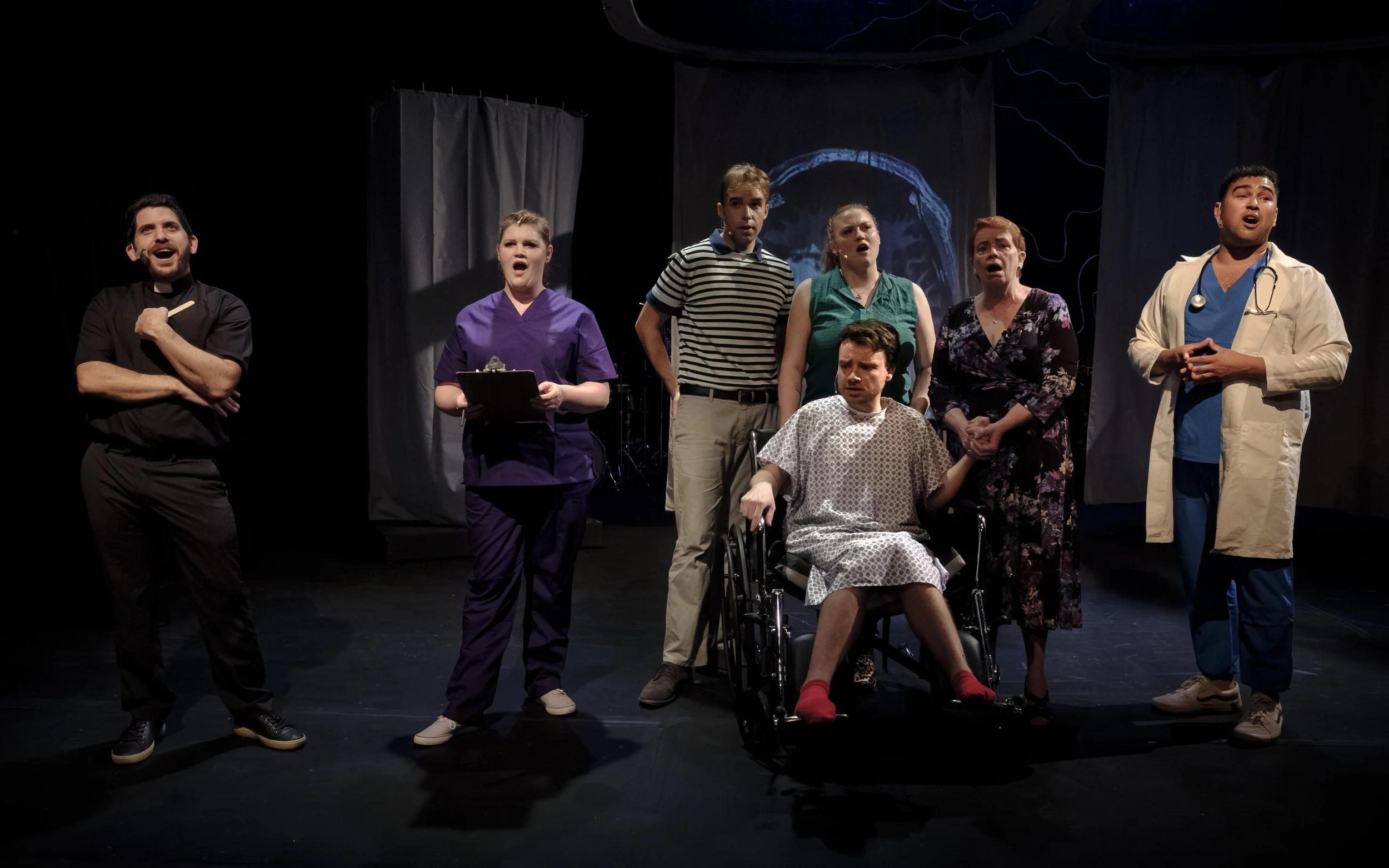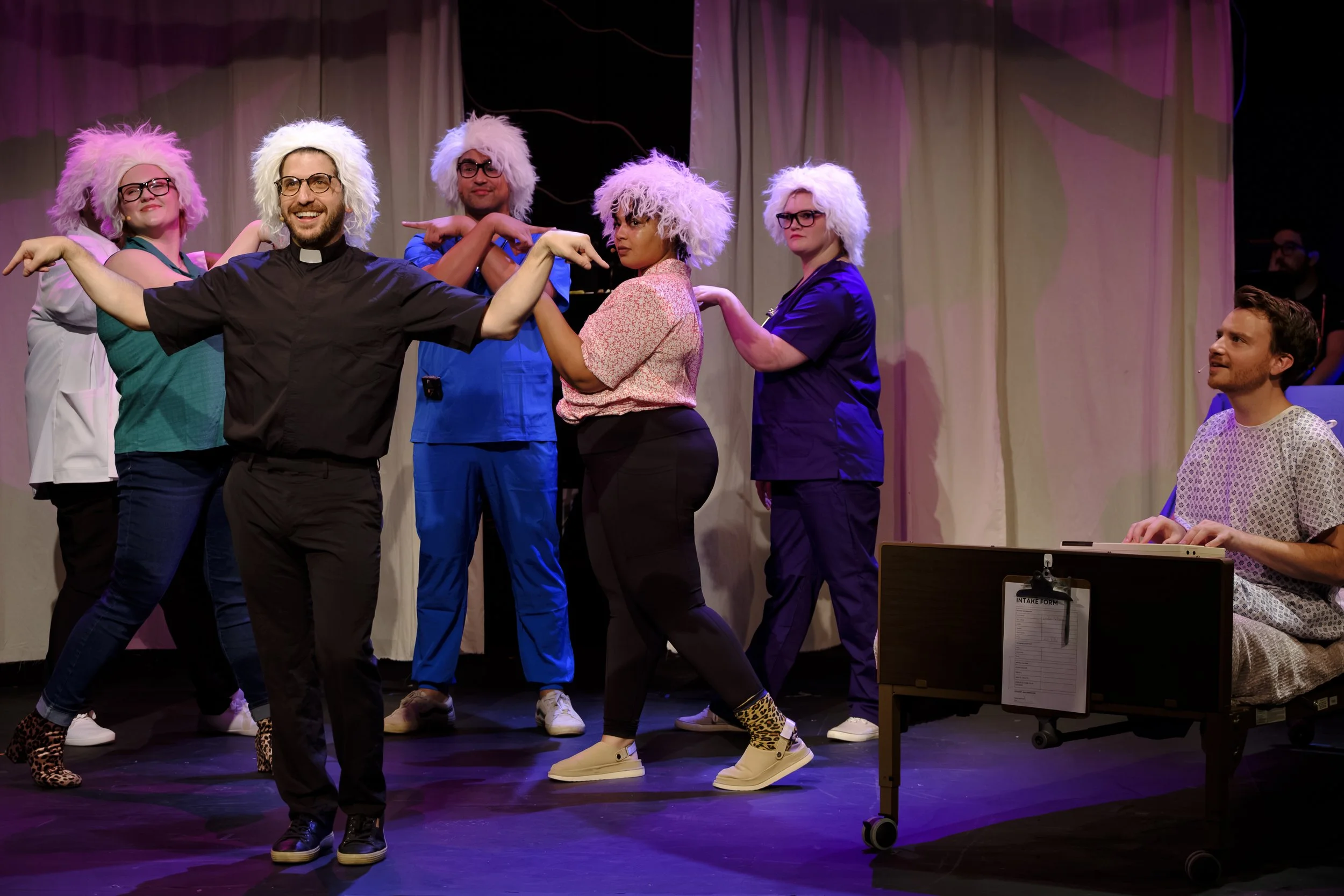 The ensemble comes dancing down the theater aisles wearing Einstein-esque wigs as they sing about “Gordo’s Law of Genetics.” And when Gordon finds himself in a coma, he’s visited by all the ensemble members in a nightmare-esque dream state.
