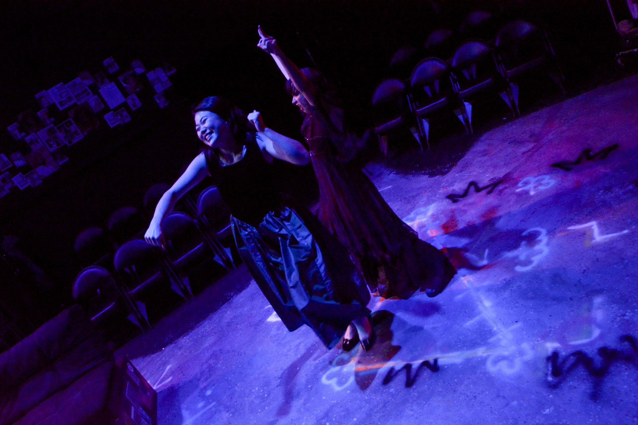 Designed in theatre in the round staging (stage design by Nina Castillo D’Angier), Mo and Steff are surrounded at all angles. The stage starts with a bed in the center with a Hello Kitty pillow and purple duvet. When the set needs to change, the two actors move all the set pieces around and the bed becomes the backseat of a car or the couch in the club greenroom. Chairs are unstacked and become inside of the classroom. Magazines are handed out to audience members who become guests at the slumber party as they sit on the floor and gossip. The bed platforms are rolled away and lights dimmed to purple UV light with smoke billowing out across the floor transporting us to the club downtown.