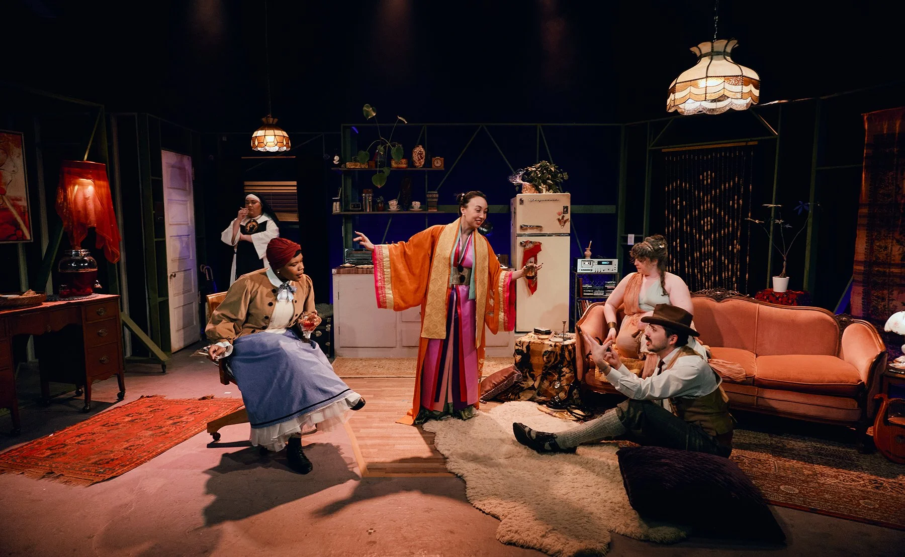 Making her entrance boldly and loudly is….a nun?? We puzzle quietly to ourselves with a furrowed brow. We didn’t think these two were particularly religious given what we’ve seen so far, but hey, we love an inclusive party. Trailing not far behind our first guest is none other than…Sappho! Now we’re starting to put the pieces together. One after another, more influential women (and one gay man) writers of the past enter this cozy apartment offering Caryl congratulations on her new play opening on the West End. It’s a big moment for her and she’s brought all her inspirations together tonight to eat, smoke, and be merry.