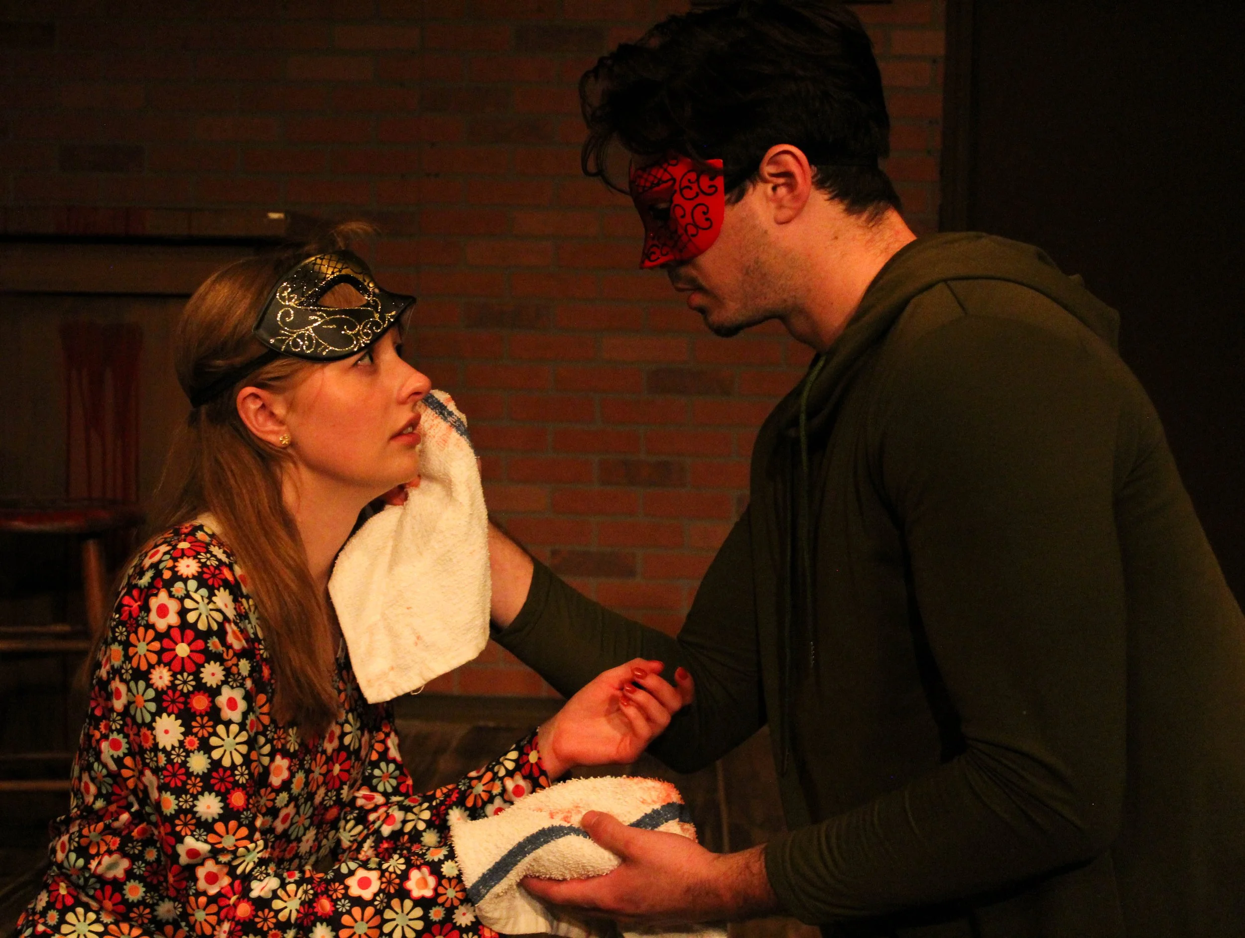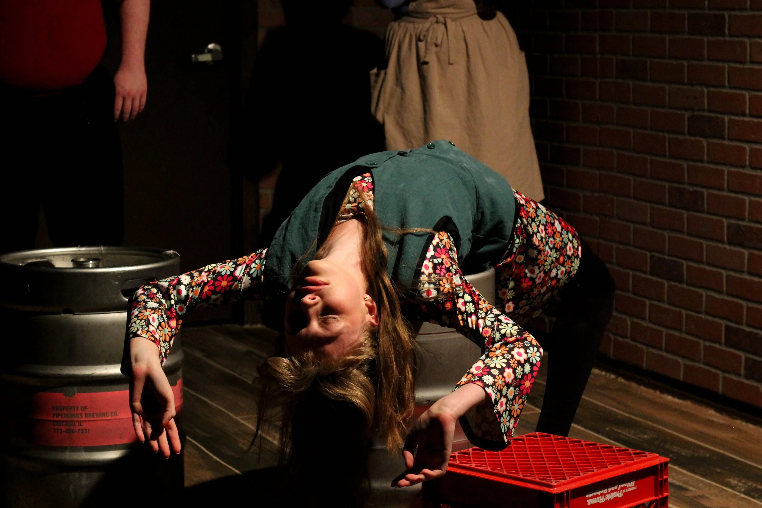 The beer kegs become the steps climbing up Rapunzel’s tower as she lets down her hair. But as we remember these are Grimm’s fairy tales, the prince played by Tara Shilkret, in dark, still flashes, finds herself tumbling back down them.