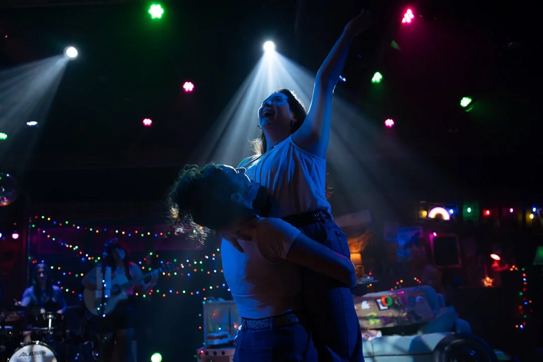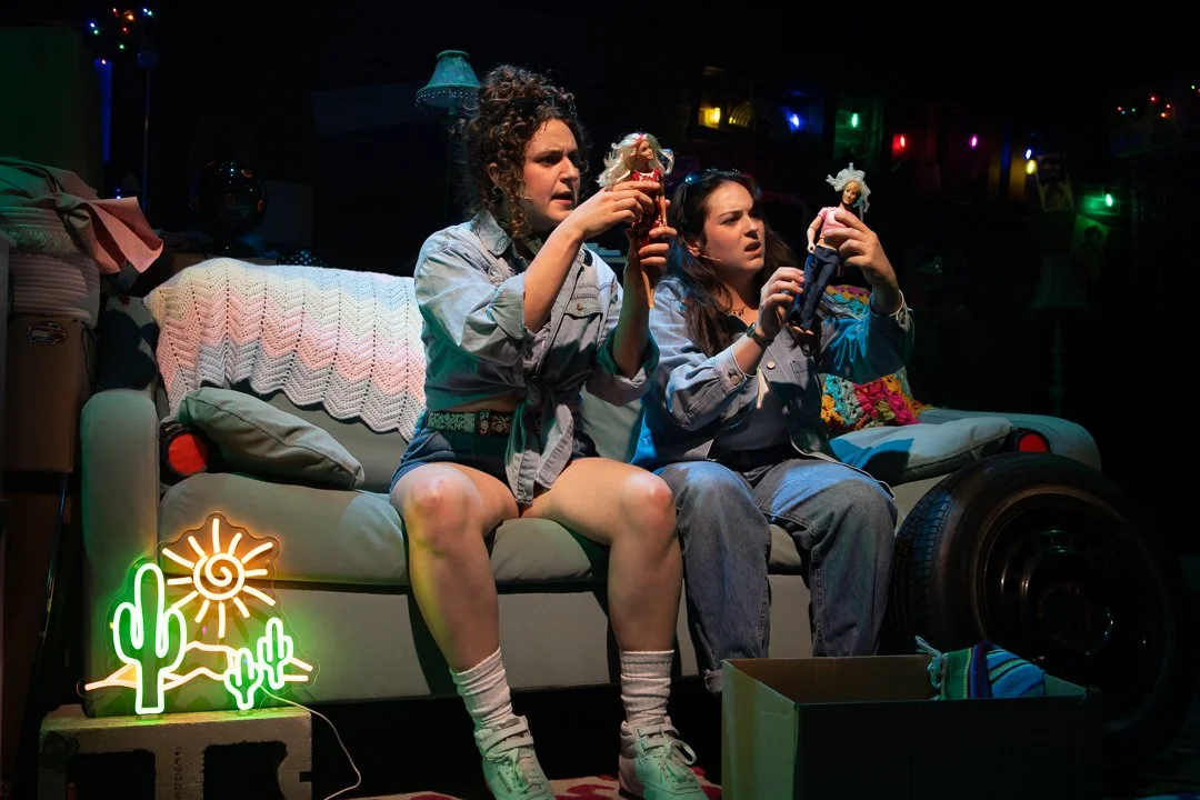 Then, the spotlight turns to two women clad in jeans, jean shorts, and jean jackets. Our titular characters, now nicknamed T and L (Carolyn Waldee and Claire Guthrie), come crashing onto the couch which then becomes their beloved Thunderbird suspended in mid-air and reality above the grand canyon. The band geeks out at finally getting to meet their lesbian heroes and launch into an avalanche of questions and fangirling (fan-theming?) while T and L are still processing what the heck is going on.