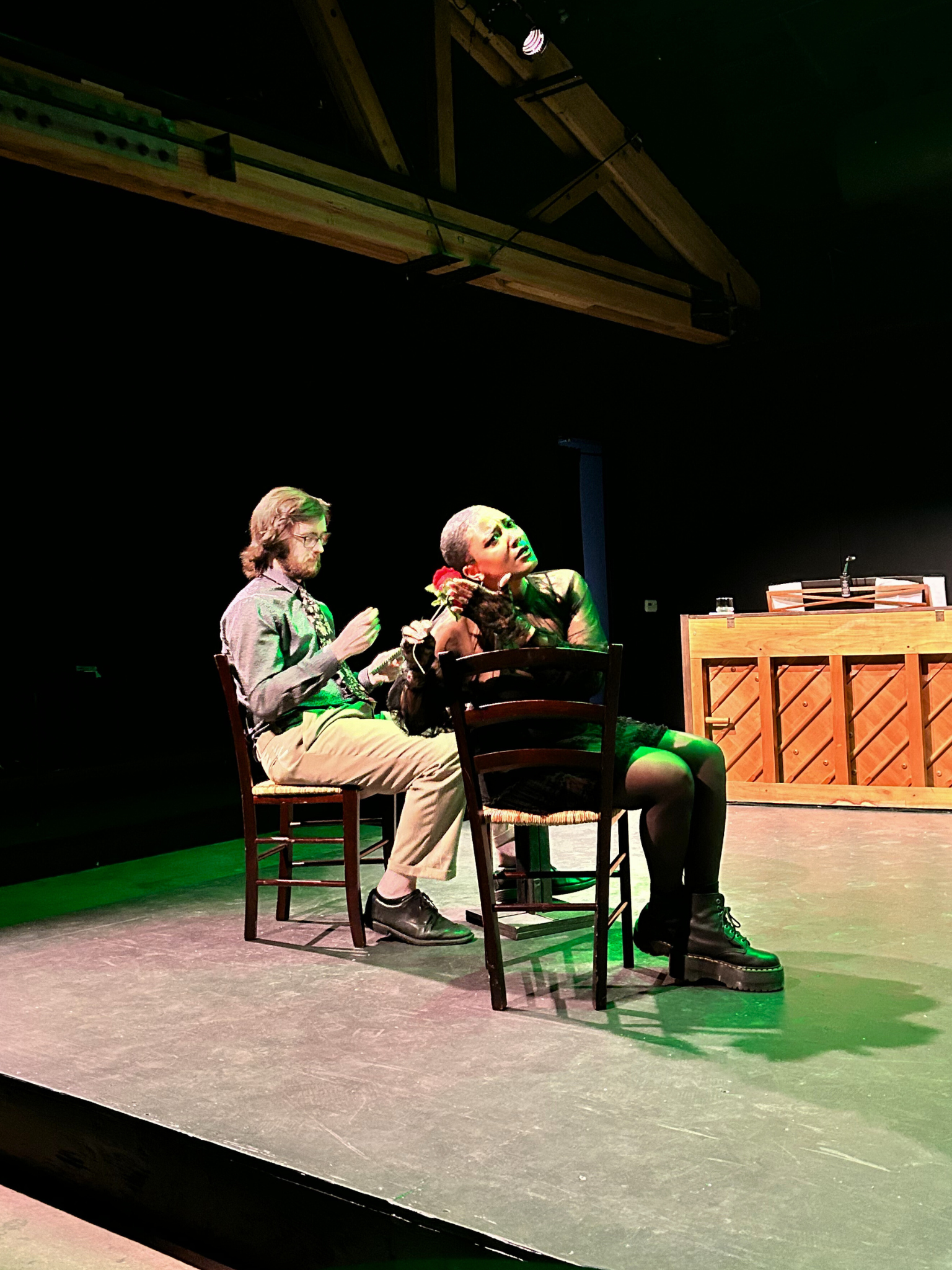 The nightly performers at the Sometimes Cafe are Daffy and Joe, a drag queen and king played by Delta Badhand and Mx. O’Lydian, who have a dancing comedy act that the regulars come to know and love. The two regulars, the medium Madame Nappu and Drew the poet, find themselves drawn to the performers. And the owner, Bob (Brian Pember) stares lovingly at his longtime live-in girlfriend, Sarah Spangle played by Katherine Petersen. They perform their own love duet with the song that becomes the cafe’s unofficial theme.